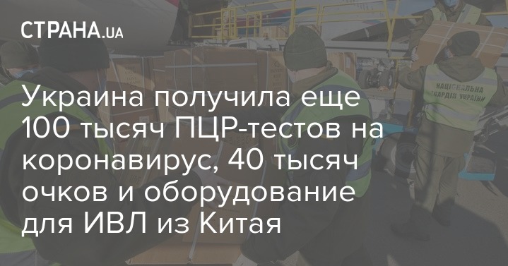 В Украину из Китая прибыло 100 тыс ПЦР-тестов для диагностики коронавируса, 40 тысяч очков многоразового использования, медицинские маски и оборудование для аппаратов искусственной вентиляции легких (ИВЛ).