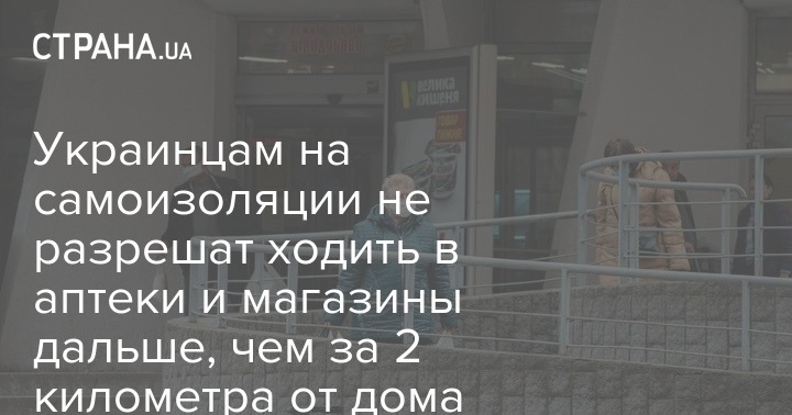 В соответствии с новым ужесточенным карантинными правилами, которые 2 апреля утвердил Кабмин, в Украине люди, которые находятся на самоизоляции, не смогут посещать продуктовые магазины и аптеки, расположенные дальше, чем в двух километрах от их дома.