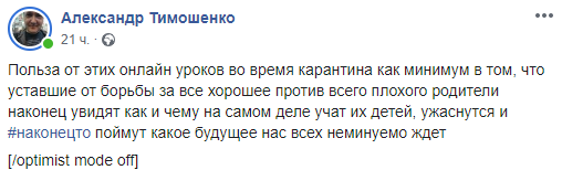 "Польза от этих онлайн уроков во время карантина как минимум в том, что уставшие от борьбы за все хорошее против всего плохого родители наконец увидят как и чему на самом деле учат их детей, ужаснутся и #наконецто поймут какое будущее нас всех неминуемо ждет" - написал журналист Александр Тимошенко.