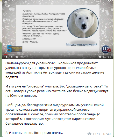 "Онлайн-уроки для украинских школьников продолжают удивлять: вот тут авторы этих уроков переселили белых медведей из Арктики в Антарктиду, где они на самом деле не водятся.