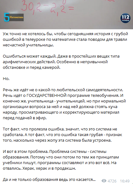 "Уж точно не хотелось бы, чтобы сегодняшняя история с грубой ошибкой в телеуроке по математике стала поводом для травли несчастной учительницы.