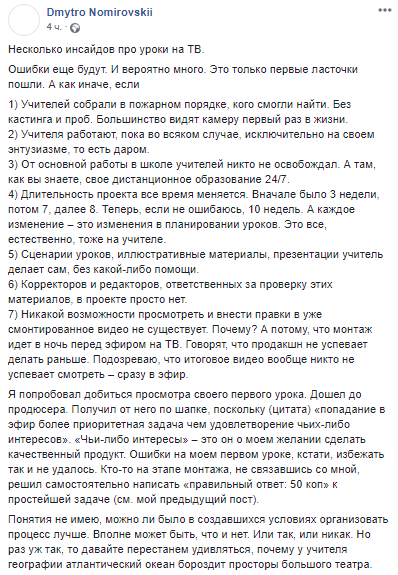 Свое мнение высказал и математик Дмитрий Номировский, также задействованный в съемках онлайн-уроков. На своей странице в Facebook он написал, что у учителей нет возможности посмотреть смонтированный материал перед эфиром, чтобы исправить ошибки, а монтаж идет в ночь перед эфиром, поскольку продакшн не успевает делать раньше. По словам математика, он попытался добиться просмотра своего первого урока и дошел до продюсера, но "получил по шапке".