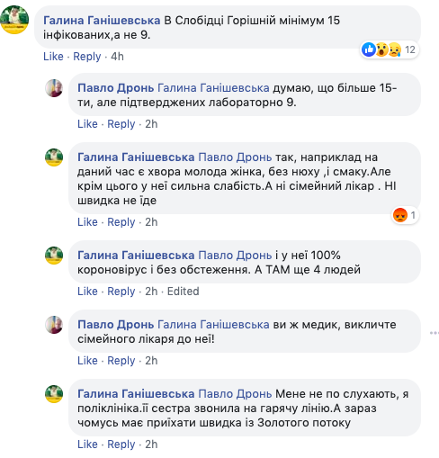 "У нее 100% коронавирус и без обследования. А там еще 4 человека", - пишет Ганишевская на странице зам главы райадминистрации и указывает, что статистика по селам Тернопольщины занижена почти вдвое. Он соглашается, что реально больных больше.