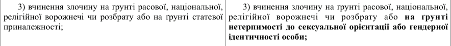 В частности, депутат предлагает дополнить Уголовный кодекс статьей, в которой говорится, что публичные призывы к вражде, преследованию или унижению достоинства из-за сексуальной ориентации должны наказываться штрафом от 200 до 500 необлагаемых налогом минимумов (3400-8500 грн), или ограничением свободы до 5 лет.