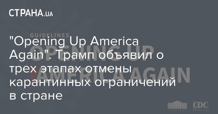 Президент США Дональд Трамп, как и обещал, представил свой план по снятию ограничений, вызванных эпидемией коронавируса Covid-19. Документ под названием "Opening Up America Again" (Снова откроем Америку) обнародован на официальном сайте Белого дома.