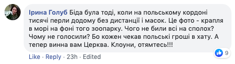 "Беда была тогда, когда на польской границе тысячи перлись домой без дистанции и масок. То фото - капля в море. Чего не били все тревогу? Почему не рыдали? Потому что каждый ждал польские деньги в дом", - пишет львовянка Ирина Голуб.