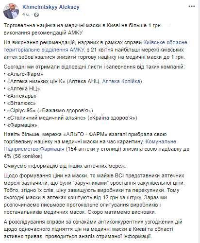 17:27 Крупнейшие сети аптек в Киеве снизят торговую наценку на медицинские маски до 1 грн. Об этом сообщил глава Киевского областного территориального отделения Антимонопольного комитета Украины  Алексей Хмельницкий. По его словам, аптеки сообщили, что подняли цены из-за роста закупочной цены, которую якобы завысили производители и перекупщики. Поэтому сегодня маски в аптеках стоят от 12 грн за штуку. Так ли это - предстоит выяснить.