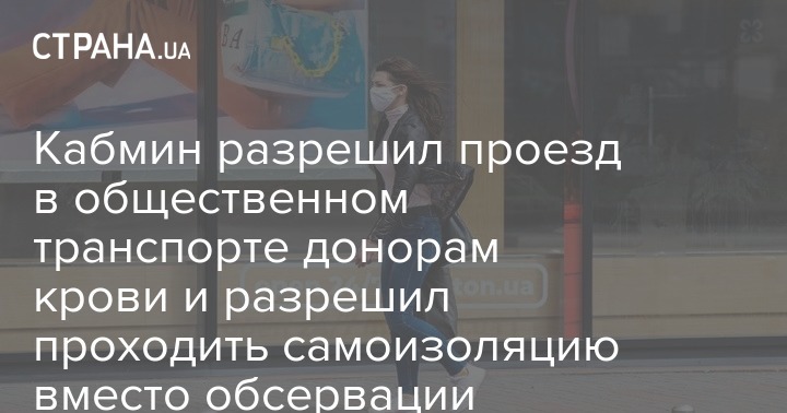 Кабинет министров Украины на заседании 22 апреля смягчил некоторые карантинные меры, несмотря на то, что продлил жесткий карантин до 11 мая. Правительство разрешило проезд в общественном транспорте донорам крови. Также принудительная обсервация заменена на самоизоляцию.