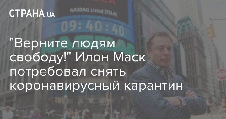 Американский предприниматель и миллиардер, основатель компаний SpaceX и Tesla Илон Маск потребовал отменить ограничительные меры, принятые в США из-за распространения коронавируса.