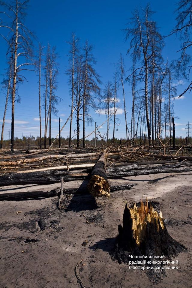 Пресс-служба Чернобыльского радиационно-экологического биосферного заповедника показала снимок, на котором запечатлены последствия прокатившихся по зоне отчуждения ЧАЭС пожаров.