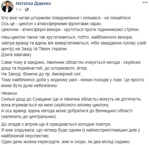 "Кто уже читал штормовое сообщение и испугался - не пугайтесь. Вот это - циклон с атмосферными фронтами сейчас. Циклоны - атмосферные вихри - крутятся против часовой стрелки. Наш циклон также крутится так, то есть, ближайший вечер, завтра утром и днем ​​он будет раскручиваться, запрокидывая голову (свой центр) на Запад и Север Украины", - написала она.