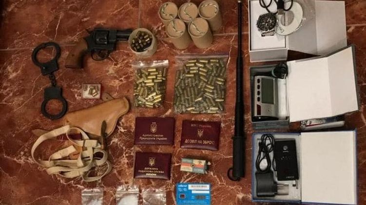Во время обысков по месту жительства злоумышленников были найдены  изъяты 9 пистолетов, боеприпасы, полицейский мундир и жетоны, разные удостоверения ( в том числе сотрудников полиции, СБУ, Офиса президента, налоговой службы), шевроны с надписями "СБУ" и "Полиция", наручники, дубинки, мобильные телефоны, более 35 000 долларов США и 500 евро, банковские карточки, большое количество наркотиков (амфетамин, метадон, героин).