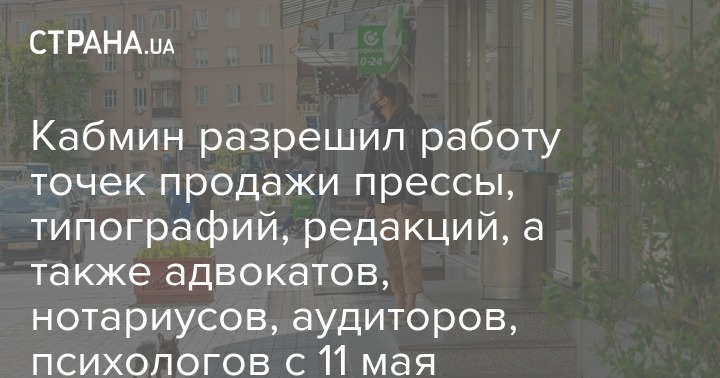 Правительство с 11 мая разрешило работу предприятий, работающих в сфере СМИ, в частности точек продажи прессы, типографий, редакций, логистических предприятий в сфере доставки бумаги и печатных изданий, а также работу адвокатов, нотариусов, аудиторов и психологов.