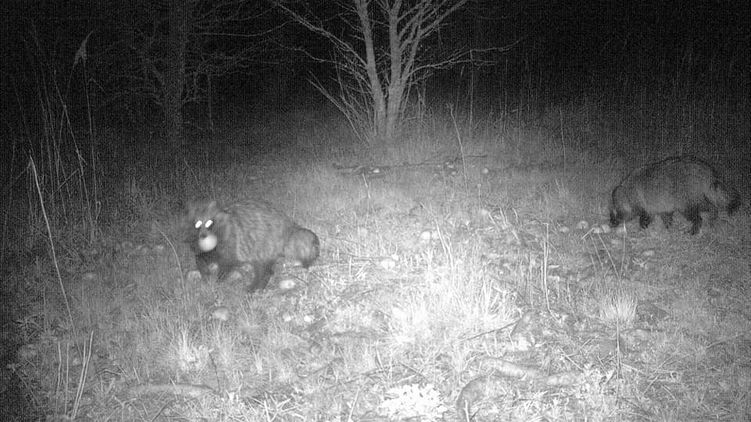 В Чернобыльском заповеднике фотоловушка поймала енотовидных собак, воровавших яблоки