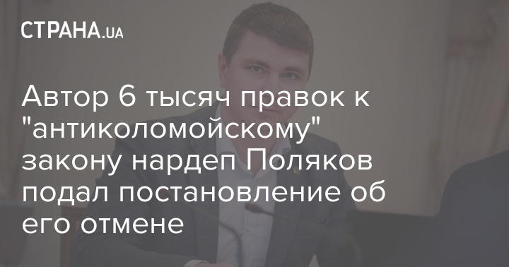 Нардеп Антон Поляков, котого исключили из фракции "Слуга народа", зарегистрировал постановление об отмене голосования за "антиколомойский закон" о банках. Ранее он же подал 6000 тыс. поправок к этом законопроекту.