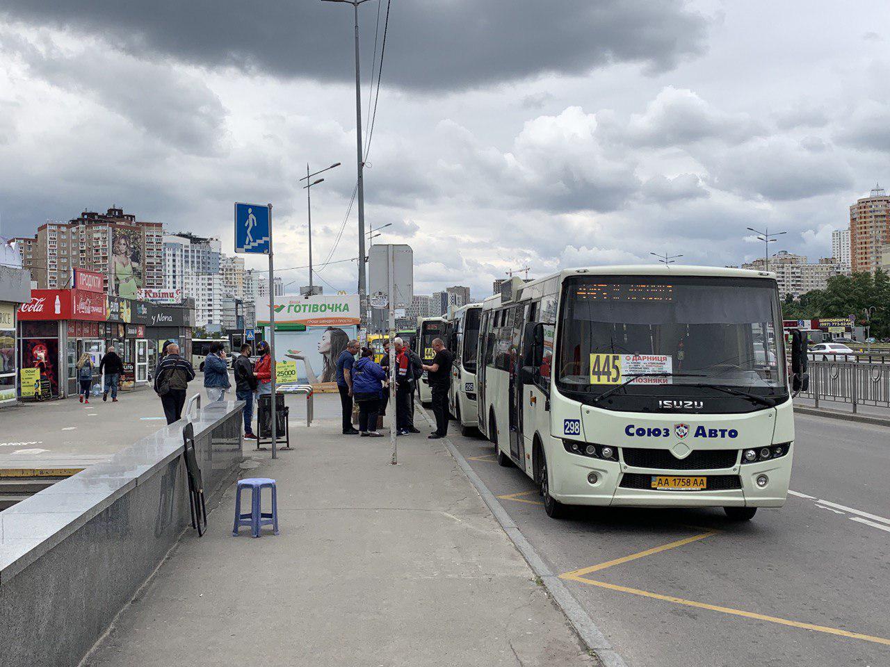 11:45 На станции метро Позняки маршрутки уже стоят, но работать будут в 12:00. Обстановка праздничная, водители и кондукторы на станции радуются началу работы.  "С 12 запускаемся. Очень рады", - кратко сообщил водитель