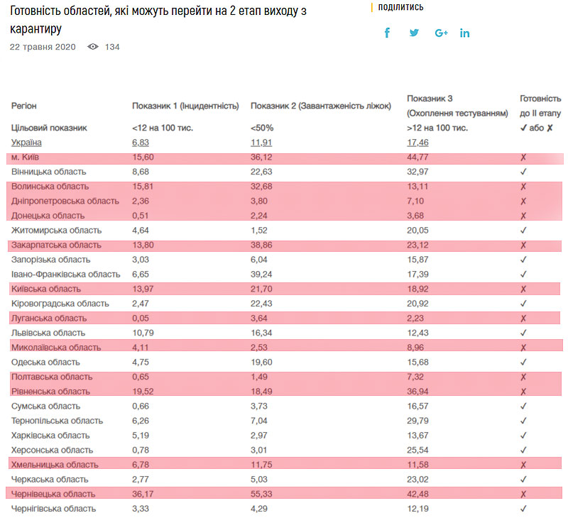 В остальных областях решения комиссия последуют сегодня-завтра, но, по-видимому, они будут совпадать с рекомендацией Минздрава, поскольку три критерия для выхода на второй этап прописаны в постановлении Кабмина.