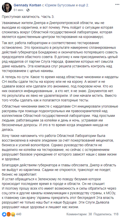 "Уважаемые жители Днепра и Днепропетровской области, мы не выходим из карантина, и вот почему. Речь пойдет о ситуации которая сложилась вокруг Областной государственной лаборатории, которая является единственным центром тестирования на коронавирус. Так вот, работа лаборатории и соответственно тестирование остановлено", - пишет Корбан.
