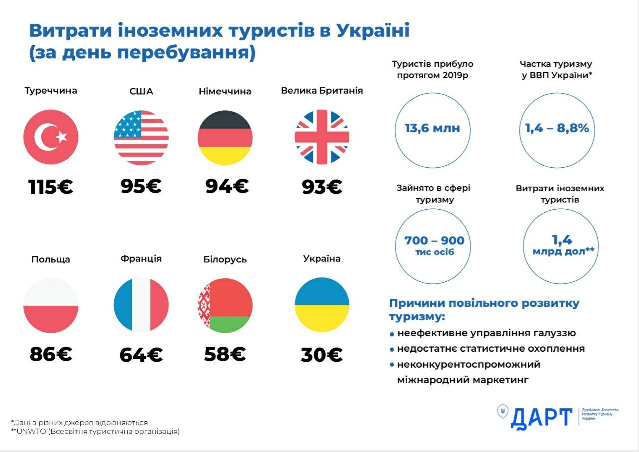В 2019 году Украину посетили 13,6 млн туристов. По данным Всемирной туристической организации, иностранные туристы в Украине израсходовали 1,4 млрд долларов. Это 8,8% ВВП страны.