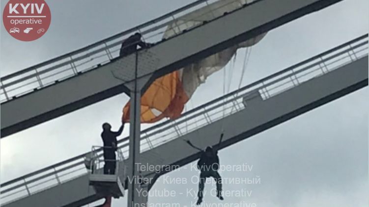 В Киеве парашютист зацепился и повис на мосту. Фото: Киев оперативный