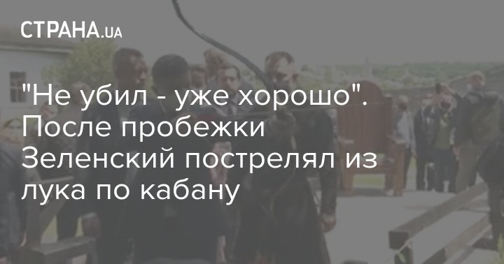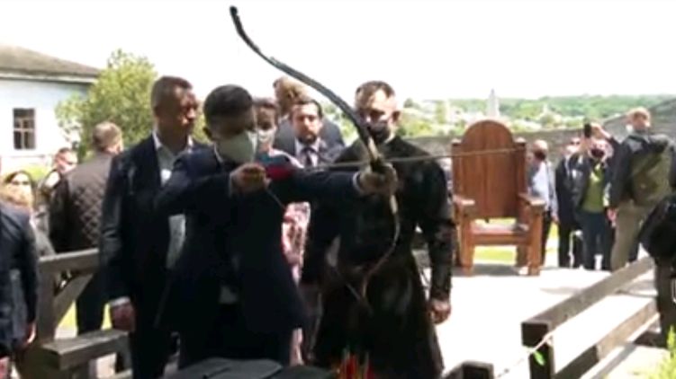 Во время экскурсии по крепости Зеленскому показали тир и предложили сделать выстрел из лука. Президент довольно тщательно прицеливался и в итоге попал в ногу нарисованному на стенде кабану.