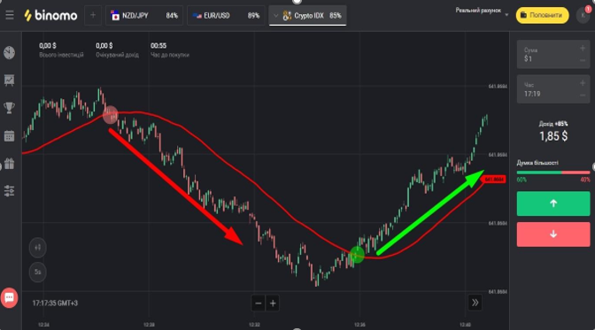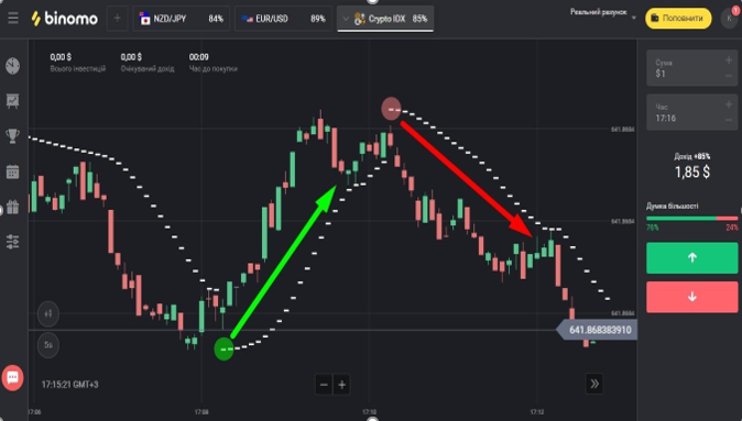 Чтобы получить дополнительный доход на нашей платформе, достаточно сделать верный прогноз относительно направления движения цены на графике в ближайшие минуты - вверх или вниз. Если, например, был куплен внебиржевой актив на повышение, и через 60 секунд цена на графике действительно направилась вверх, то на счет начисляется прибыль в размере около 80–90% от стоимости сделки.