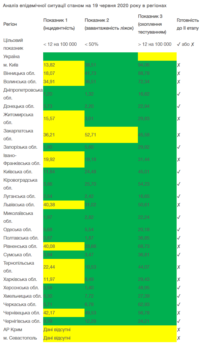 Об этом сообщается на сайте Министерства здравоохранения. Пресс-служба ведомства также привела таблицу по областям соответствия критериям.