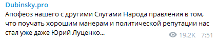 "Апофеоз нашего с другими Слугами Народа правления в том, что поучать хорошим манерам и политической репутации нас стал уже даже Юрий Луценко", - написал он в Телеграме.