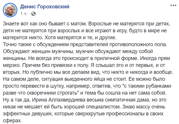 Точно так же с обсуждением представителей противоположного пола. Обсуждают женщин мужчины, мужчин обсуждают между собой женщины. Не всегда это происходит в приличной форме. Иногда прям мерзко. Причем без привязки к полу. Я слышал это и от первых, и от вторых. Но публично мы все делаем вид, что никто и никогда и вообще. На самом деле, ситуация выеденного яйца не стоит. Ее можно было просто перевести в шутку, например, ответив, что "с такими рубанками разве что скворечники строгать" и тема бы сошла на нет сама собой. Ну а так да, Ирина Аллахвердиева весьма симпатичная дама, но это никак не мешает ей быть хорошим специалистом. Знаю массу очень эффектных девушек, которые сверхкрутые профессионалы в своих сферах", - написал он у себя в Фейсбуке.