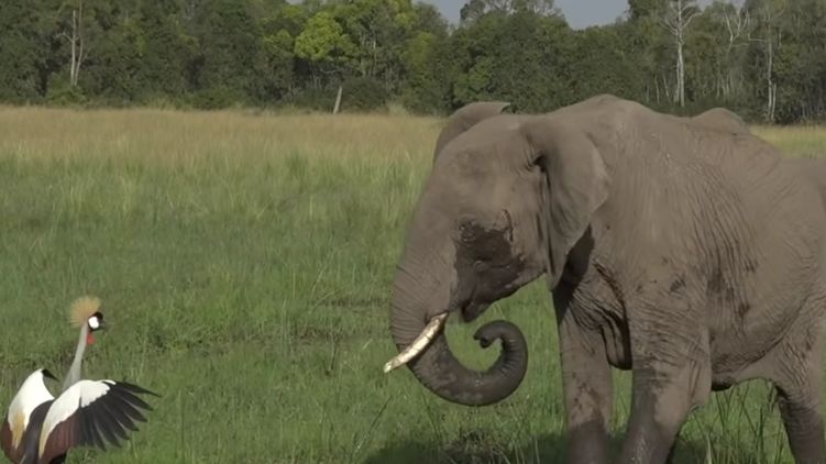 Так, на видео коронованный журавль агрессивно пытается согнать с поляны слона, расставляя свои крылья и издавая пронзительный крик.