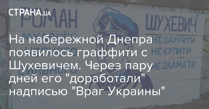 На набережной Днепра появилось граффити с Шухевичем. Через пару дней его "доработали" надписью "Враг Украины"