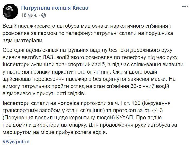 В Киеве задержали водителя автобуса в состоянии наркотического опьянения, фото: facebook.com/kyivpatrol
