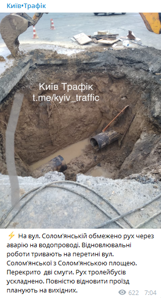 Утром в четверг, 9 июля, в Киеве из-за аварии на водопроводе ограничили движение на улице Соломенской. Перекрыто две полосы.