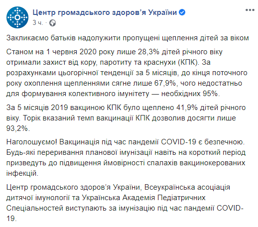 По состоянию на 1 июня 2020 года в Украине только 28,3% детей в возрасте одного года вакцинированы от кори, паротита и краснухи (КПК). Об этом сообщается на странице Центра общественного здоровья (ЦОЗ) в соцсети.