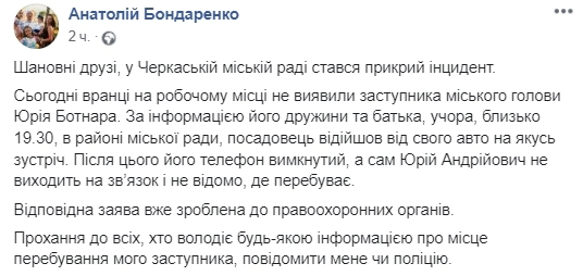 "Сегодня утром на рабочем месте не обнаружили заместителя городского головы Юрия Ботнара. По информации его жены и отца, вчера, около 19:30, в районе городского совета, чиновник отошел от своего авто на какую-то встречу. После этого его телефон отключен, а сам Юрий Андреевич не выходит на связь и не известно, где находится", - написал Бондаренко.
