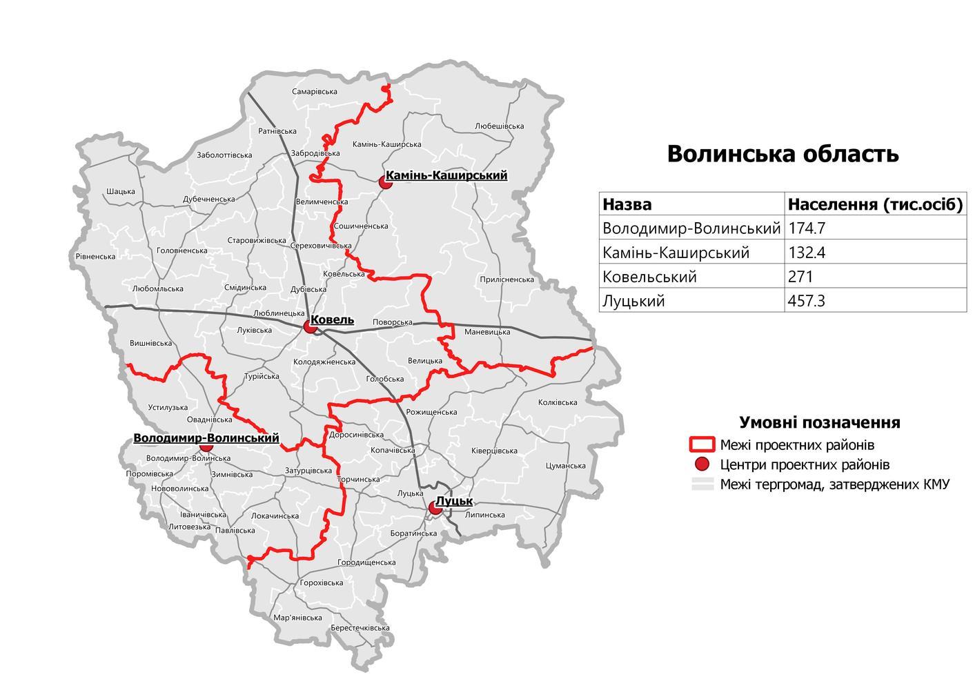 Ковельский район (с административным центром в городе Ковель) в составе территорий Велимченской сельской, Велицкой сельской, Вишневской сельской, Голобской поселковой, Головненской поселковой, Дубеченской сельской, Дубовской сельской, Заболотовской поселковой, Забродовской сельской, Ковельской городской, Колодяжненской сельской, Луковской поселковой, Люблинецкой поселковой, Любомльской городской, Поворской сельской, Ратнивской поселковой, Ровенской сельской, Самаровской сельской, Сереховичивской сельской, Смидинской сельской, Старовиживской поселковой, Турийской поселковой, Шацкой поселковой территориальных общин;