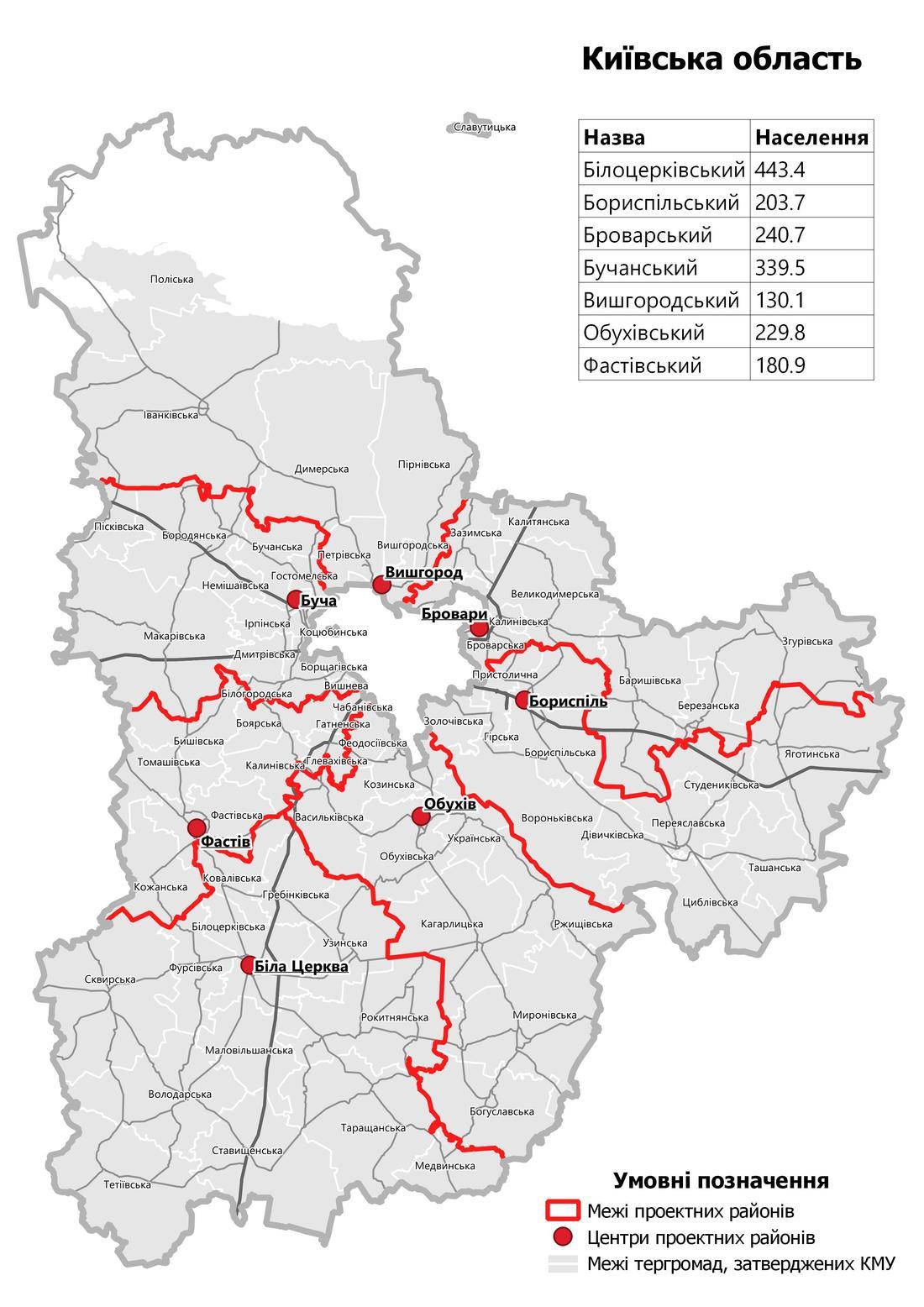 Белоцерковский район (с административным центром в городе Белая Церковь) в составе территорий Белоцерковской городской, Володарской поселковой, Гребенковской поселковой, Ковалевской сельской, Маловильшанской сельской, Медвинской сельской, Рокитнянской поселковой, Сквирской городской, Ставищенской поселковой, Таращанской городской, Тетиевской городской, Узинской городской, Фурсовской сельской территориальных общин;