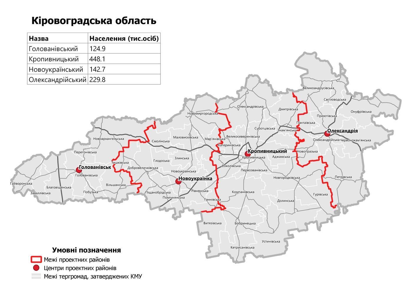 Новоукраинский район (с административным центром в городе Новоукраинка) в составе территорий Ганновской сельской, Глодосской сельской, Добровеличковской поселковой, Злинской сельской, Маловисковской городской, Марьяновской сельской, Новомиргородской городской, Новоукраинской городской, Песчанобродской сельской, Помичнянской городской, Ровненской сельской, Смолинской поселковой, Тишкивской сельской территориальных общин;