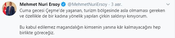 Отреагировали на это и в Турции.  "Я осуждаю ужасное нападение в Чешме. Этого не должно быть в туристическом районе, особенно в отношении женщины", - написал в Твиттере министр культуры и туризма Турции Мехмет Нури Эрсой.