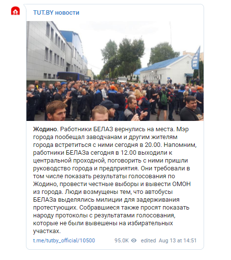 "Мэр города пообещал заводчанам и другим жителям города встретится с ними сегодня в 20:00. Напомним, работники БЕЛАЗа сегодня в 12:00 выходили к центральной проходной, поговорить с ними пришли руководство города и предприятия. Они требовали в том числе показать результаты голосования по Жодино, провести честные выборы и вывести ОМОН из города",- говорится в сообщении.