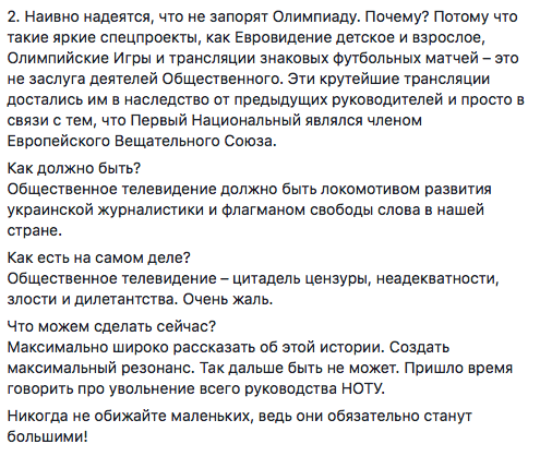 2. Наивно надеяться, что не запорят Олимпиаду. Почему? Потому что такие яркие спецпроекты, как Евровидение детское и взрослое, Олимпийские Игры и трансляции знаковых футбольных матчей – это не заслуга деятелей Общественного. Эти крутейшие трансляции достались им в наследство от предыдущих руководителей и просто в связи с тем, что Первый Национальный являлся членом Европейского Вещательного Союза.