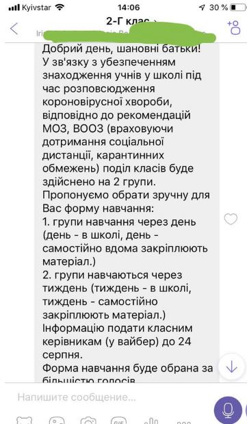 Так, журналистка Леся Падалка написала, что в ее родительский чат в Вайбере пришла информация, что в школе решили обучать детей 1 сентября группами через день.