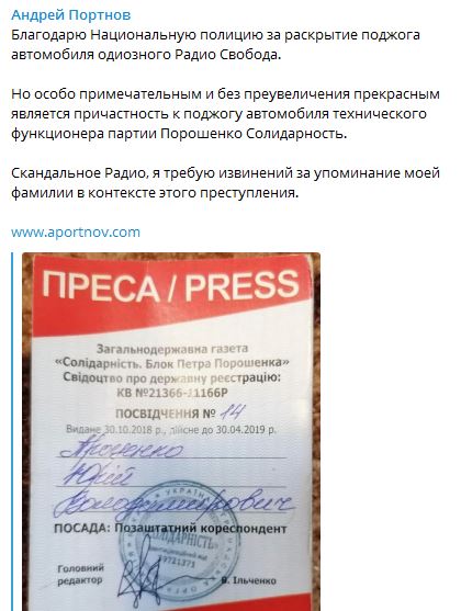 Юрист Андрей Портнов в телеграм-канале написал, что к поджогу причастен технический функционер партии Петра Порошенко "Солидарность" и обнародовал фото журналистского удостоверения на имя Юрия Проценко.