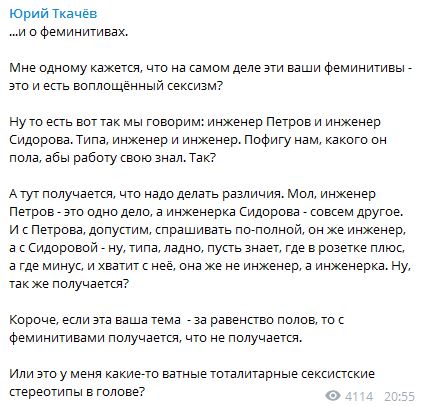 Журналист Юрий Ткачев написал, что феминитивы - это и есть воплощенный сексизм.