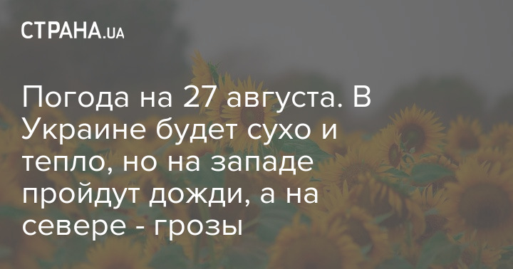 В четверг, 27 августа, практически во всех областях Украины ожидается сухая и солнечная погода. Температура будет держаться в пределах +27...+30 градусов тепла. Дожди пройдут только в западной и северной части страны.