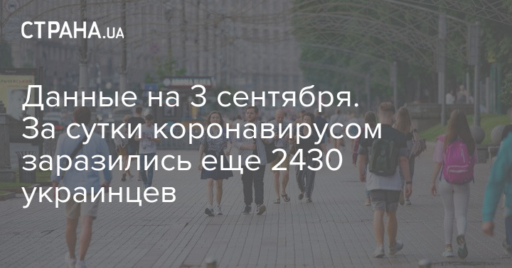По состоянию на утро четверга, 3 сентября, в Украине выявлено 2430 новых случаев заболевания Covid-19, что на 65 меньше, чем в предыдущий день. Таким образом, общее число заразившихся коронавирусом с начала эпидемии в стране выросло до 128 228 человек.
