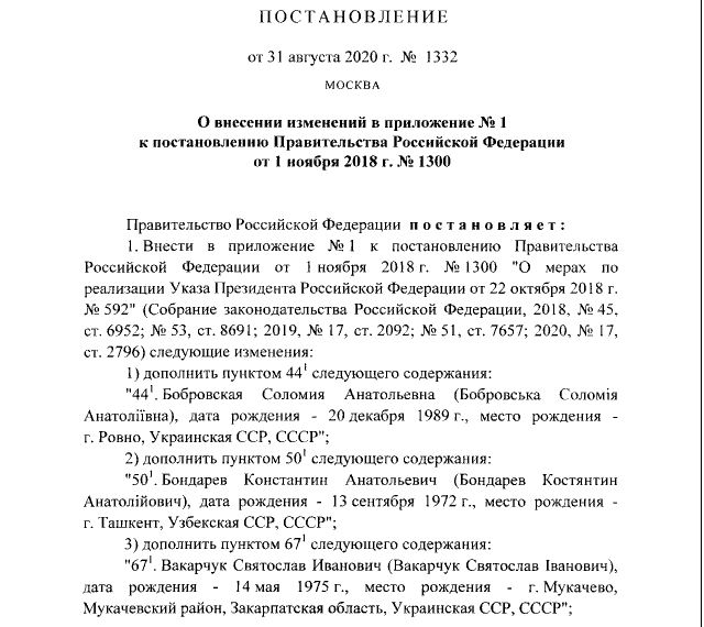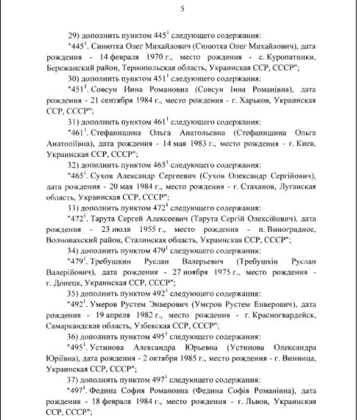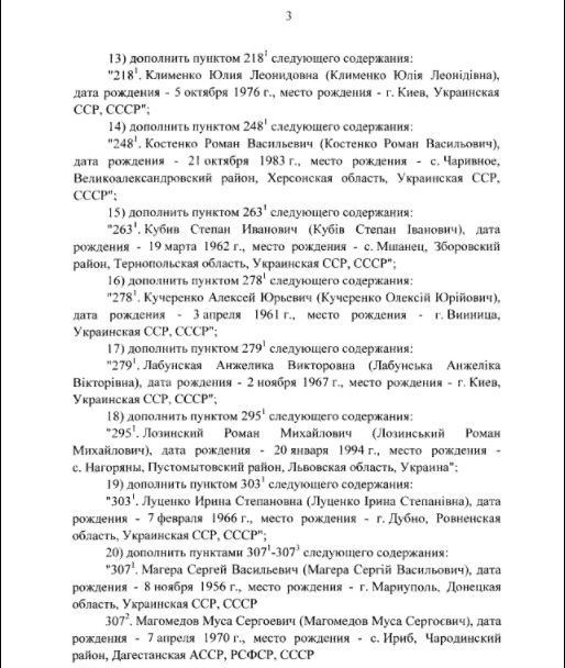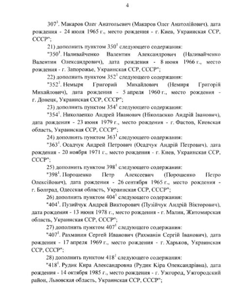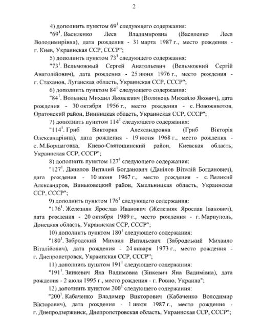 Также в список внесли экс-лидера партии "Голос" Святослава Вакарчука, главу Независимого профсоюза горняков Украины Михаила Волынца, советника первого вице-премьера Степана Кубива, нардепа Киру Рудик. Всего в список добавили 42 человека.