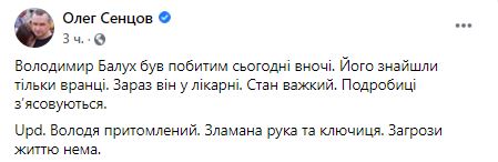 "Владимир Балух был избит сегодня ночью. Его нашли только утром. Сейчас он в больнице. Состояние тяжелое. Подробности выясняются", - написал Сенцов.