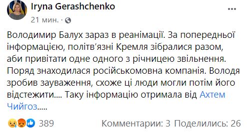 "По предварительной информации, политзаключенные Кремля собрались вместе, чтобы поздравить друг друга с годовщиной освобождения. Рядом находилась русскоязычная компания. Володя сделал замечание, похоже, эти люди могли потом его отследить .... Такую информацию получила от Ахтема Чийгоза (нардепа фракции "Евросолидарность", замглавы Меджлиса крымскотатарского народа – Ред.)", - написала Геращенко в Фейсбуке.