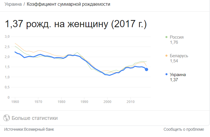 Однако, как мы видели из данных Всемирного банка, именно при Януковиче рождаемость впервые в истории независимой Украины достигла предела 1,5 рождений на женщину. И держалась на этой точке по инерции устойчиво с 2012 по 2015 год. После чего начался резкий спад, который идет до сих пор и уже находится в пределах 1,37.